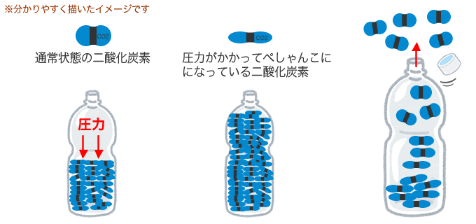 ペットボトルのフタを開けると容器の圧力が下がり、二酸化炭素は外に出ようと溶け出します。シュワシュワと気泡になって見えるのは、溶け出した二酸化炭素です。