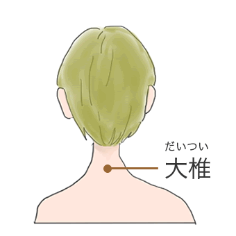 まず、下を向いて首を左右に振ってください。振ったときに動く骨の一番下にあるツボが大椎です。首や肩のハリが強いときのツボです。