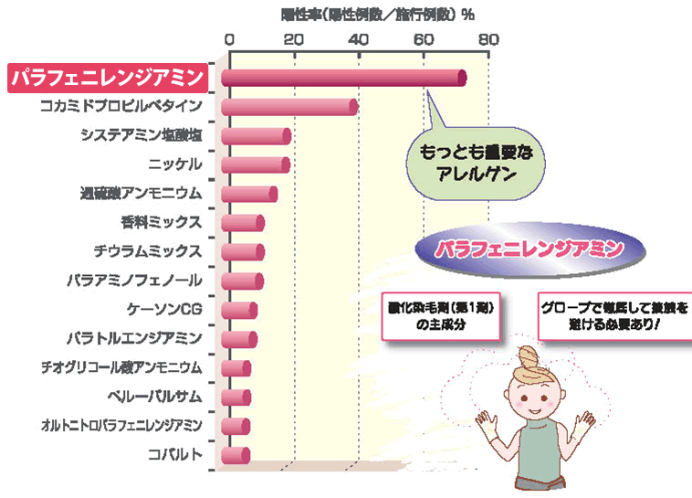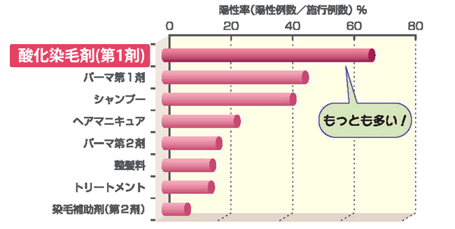 上図からもアレルギーの起こる可能性が最も高いアレルゲンは、ヘアカラー剤・染毛剤に含まれるジアミン(酸化染毛剤)だと分かります。