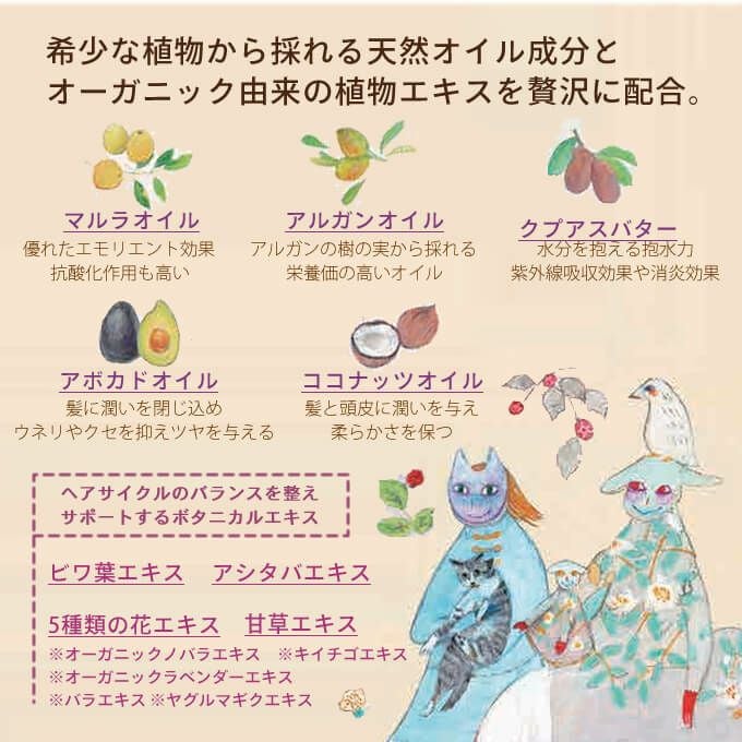 マルラオイル、アルガンオイル、クプアスバター、ココナッツオイル、アボカドオイル