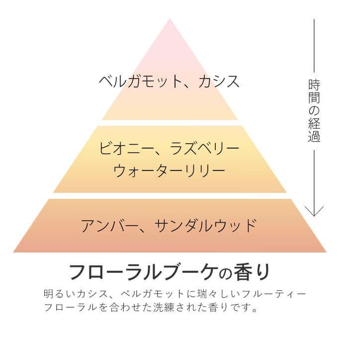 明るいカシス、ベルガモットに瑞々しいフルーティーフローラルを合わせた洗練されたフローラルブーケの香り。