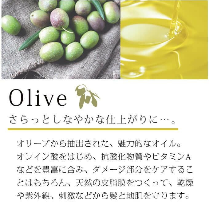 オレイン酸をはじめ、ビタミンE、ポリフェノールやビタミンAなどを豊富に含み、ダメージ部分をケアすることはもちろん、天然の皮脂膜をつくって、乾燥や紫外線、刺激などから髪と地肌を守り、健やかな芯のある髪に導きます。