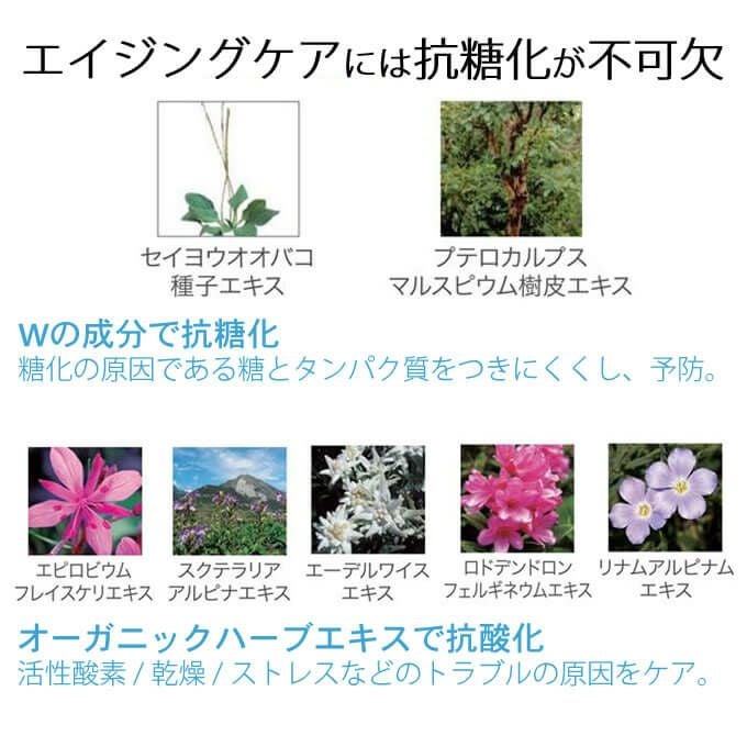 - 水、セタノール、ジメチコン、ステアリルトリモニウムブロミド、イソプロパノール、プテロカルプスマルピウム樹皮エキス、セイヨウオオバコ種子エキス、ジラウロイルグルタミン酸リシンNa、コメヌカスフィンゴ糖脂質、カキタンニン、スクテリアアルピナ花/葉/茎エキス、ヤナギハッカエキス、リヌムアルピヌム花/葉/茎エキス、エーデルワイスエキス、エピロビウムフレイスケリエキス、グリシン、アラニン、プロリン、セリン、トレオニン、アルギニン、リシン、グルタミン酸、ヘマチン、テトラヘキシルデカン酸アスコルビルト、トコフェロール、パルミチン酸レチノール、パンテノール、シメン-5-オール、スクワラン、ピーナッツ油、水添レシチン、リゾレシチン、(アミノエチルアミノプロピルメチコン/ジメチコン)コポリマー、PCA-Na、ベタイン、ソルビトール、マンニトール、エタノール、BG、グリセリン、クエン酸Na、コハク酸2Na、乳酸、EDTA-2Na、フェノキシエタノール、硫酸亜鉛、香料