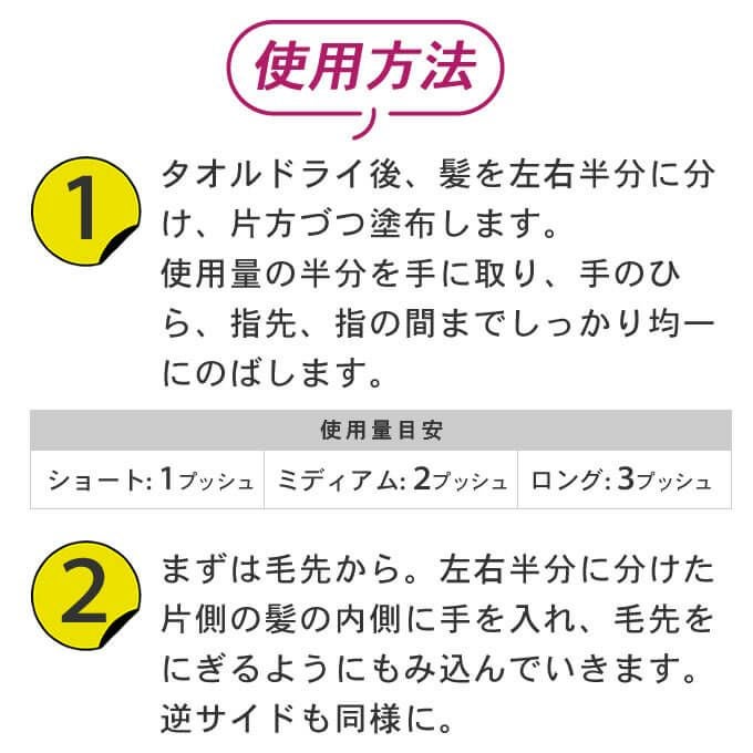 - タオルドライ後、適量を手に取り、中間~毛先に指を通しながら塗布します。