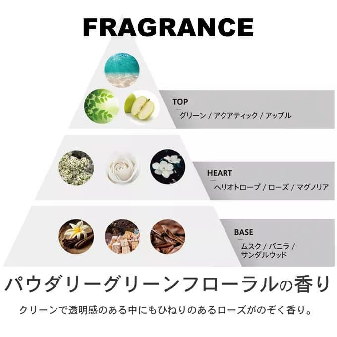 クリーンで透明感のあるなかにもひねりのあるローズがのぞく、くせになる香りで継続使用を促します。