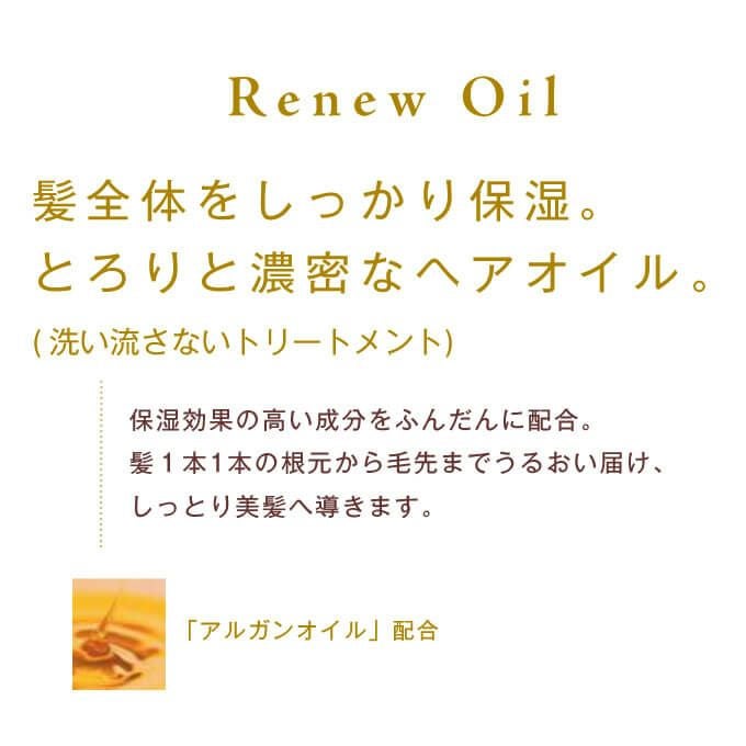 保湿効果の高い成分を独自の配合でブレンド。髪内部の間充物質のすみずみにまでうるおいを届け、髪1本1本の根元から毛先までしっとりと若々しい髪へと導きます。
