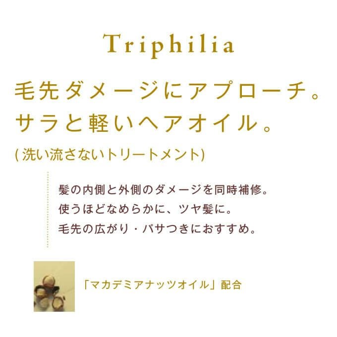 - ドライヤーの熱から髪を守るために、「リニューオイル」または「トライフィリア」を塗布します。ダメージが気になる部分には、よりていねいに。ドライヤーは髪から15cmほど離して、温風が1ヶ所に集中しないように気をつけながら、なるべく短時間で乾かしましょう。(洗い流す必要はありません)