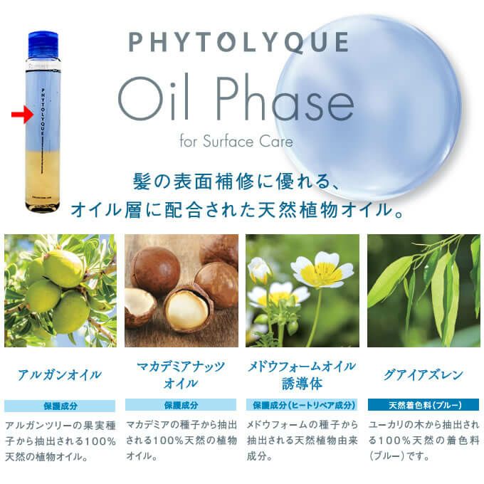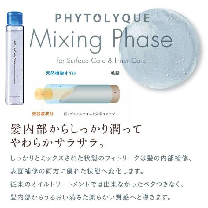 髪の内部の補修・浸透に優れた水溶性のトリートメント(美容液成分)と、オイルトリートメント(植物オイル)の保護力の両方の機能を兼ね備えた、今までにはないハイブリッド型の2層式洗い流さないトリートメント。