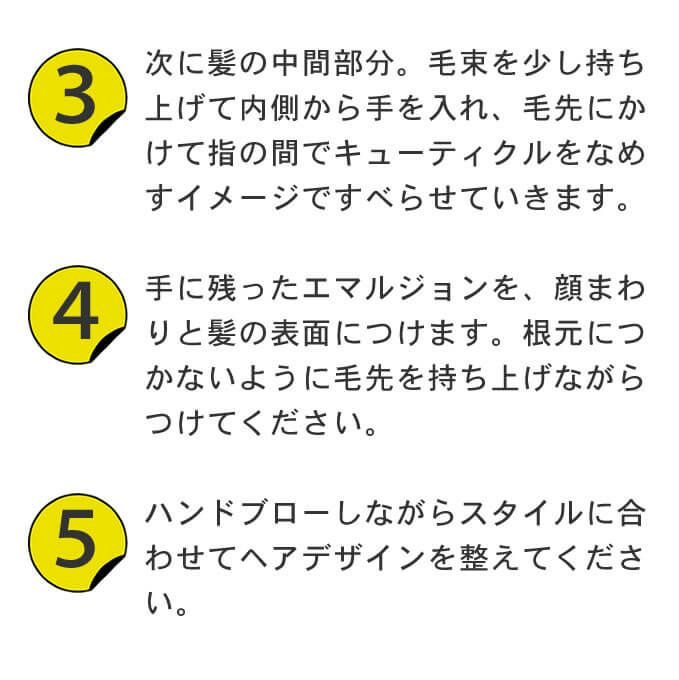 - タオルドライ後、適量を手のひらでよくのばし、毛先中心に塗布し、髪全体によくなじませます。その後、乾かして仕上げます。