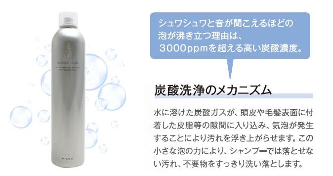 水に溶けた炭酸ガスが、頭皮や毛髪表面に付着した皮脂などの隙間に入り込み、気泡が発生することにより汚れを浮き上がらせます。この小さな泡の力により、シャンプーでは落とせない汚れ、不要物をすっきり洗い落とします。