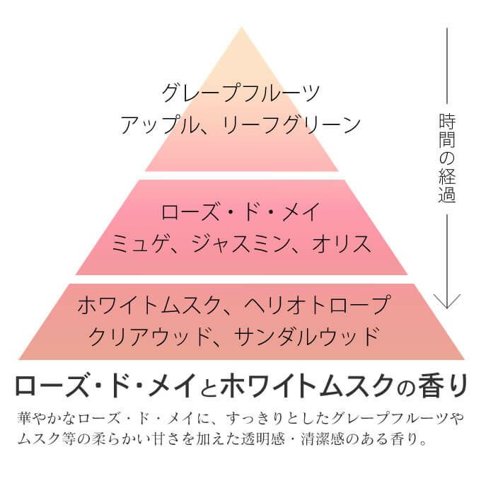 華やかなローズ・ド・メイに、すっきりとしたグレープフルーツやムスク等の柔らかい甘さを加えた透明感・清潔感のある香りです。