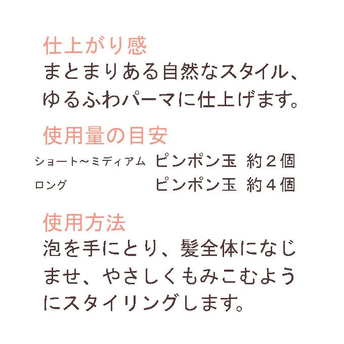 - 泡を手にとり、髪全体になじませ、やさしくもみこむようにスタイリングします。