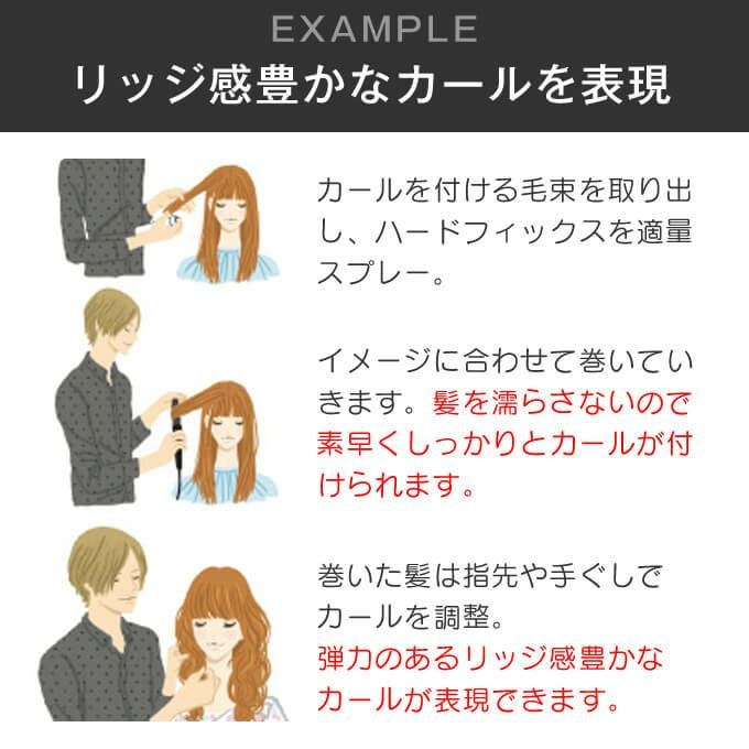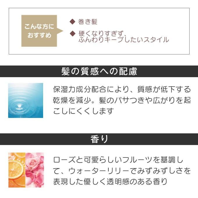 巻き髪など、硬くなりすぎずにふんわりとキープしたいスタイルにオススメ♪