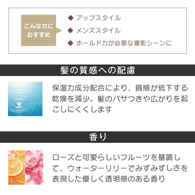 アップスタイルやメンズスタイル、ホールド力が必要なショーや撮影シーンにオススメ♪
