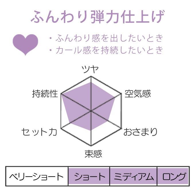 アイロンなどでつくったカールスタイルをキープさせ、やわらかな手触りが続く弾力仕上げ。