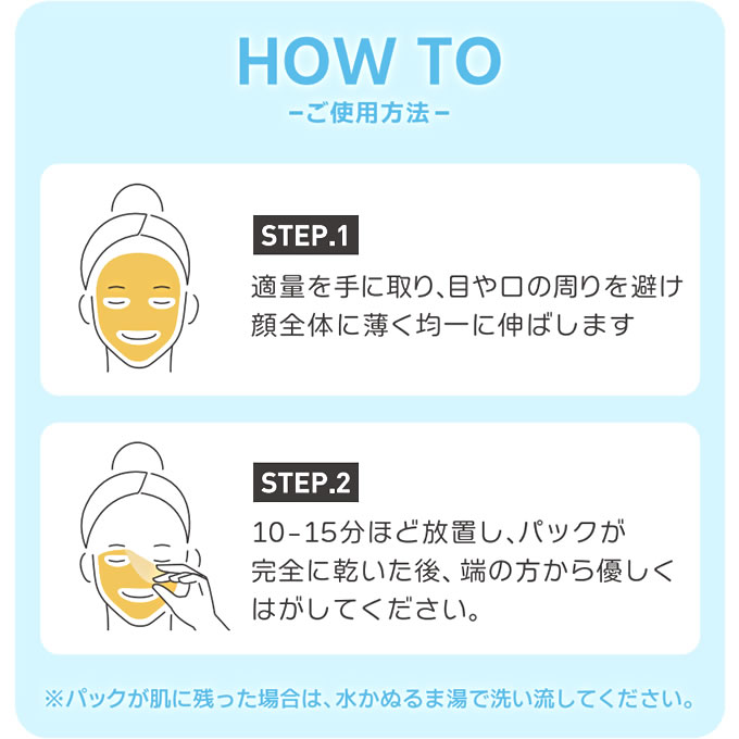 ※パックが肌に残った場合は、水かぬるま湯で洗い流してください。