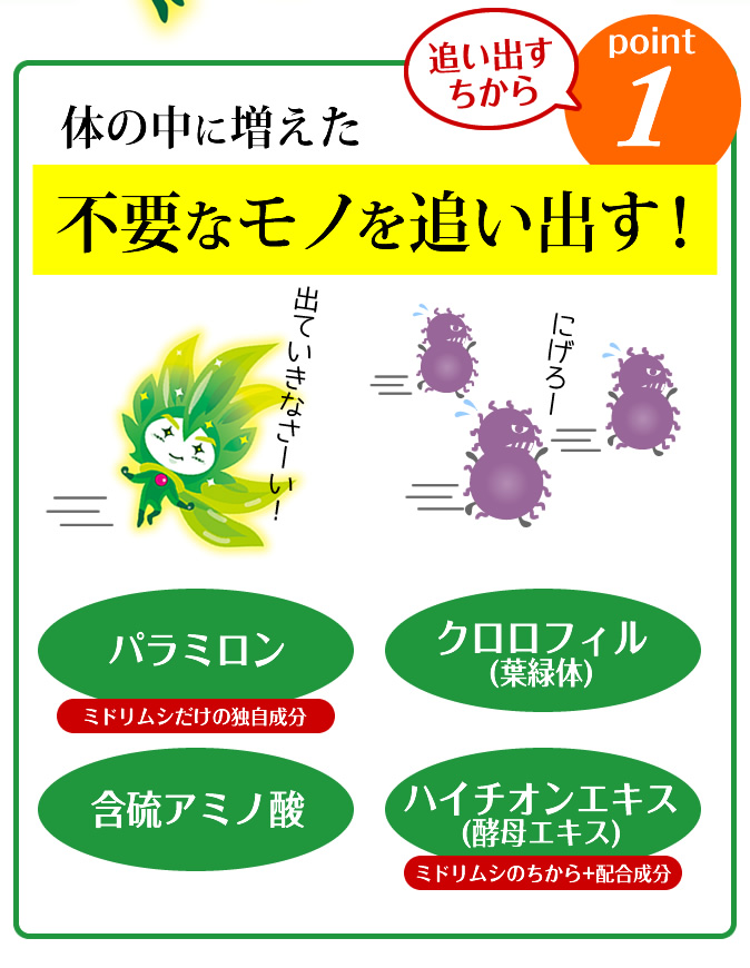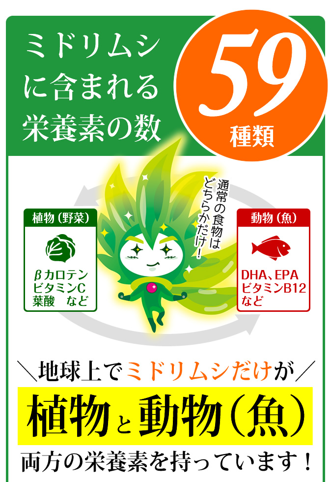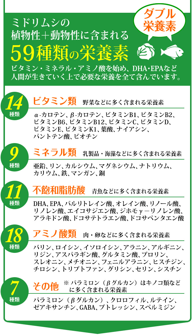 - ユーグレナグラシリス(国内製造)、ゼラチン、澱粉、デキストリン、植物発酵エキス(糖蜜、黒砂糖、ヨモギ、ウコン、その他)、α-リポ酸、コエンザイムQ10、穀物麹(大麦、あわ、ひえ、きび、たかきび、紫黒米、米粉)、乳糖、有胞子性乳酸菌/ステアリン酸カルシウム、微粒二酸化ケイ素、ベニバナ色素、クチナシ色素(一部にリンゴ・大豆・キウイフルーツ・バナナ・モモを含む)