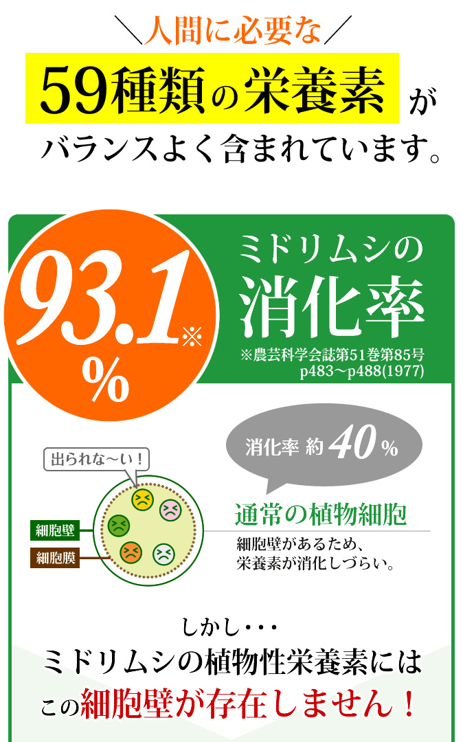 ビタミン、ミネラル、アミノ酸、不飽和脂肪酸など、人間が生きていくために必要な栄養素のほとんどを補うことができます。