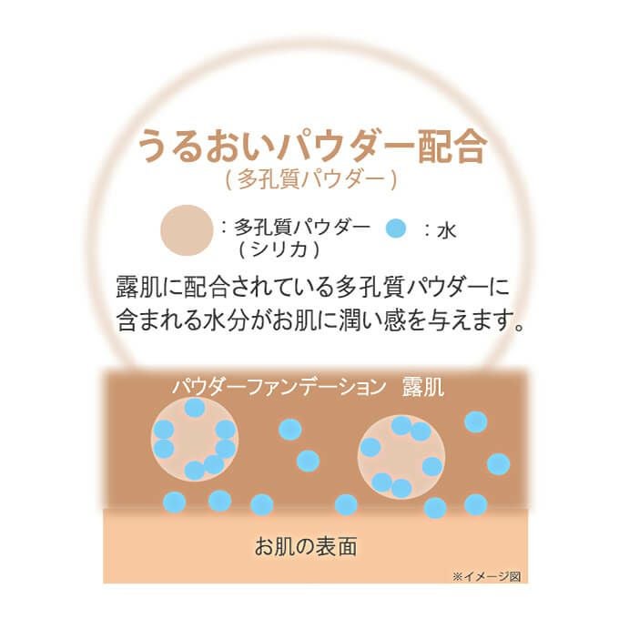 水を含んだ多孔質パウダーが、肌に潤い感を与え、夜まで崩れにくい仕上がりに。