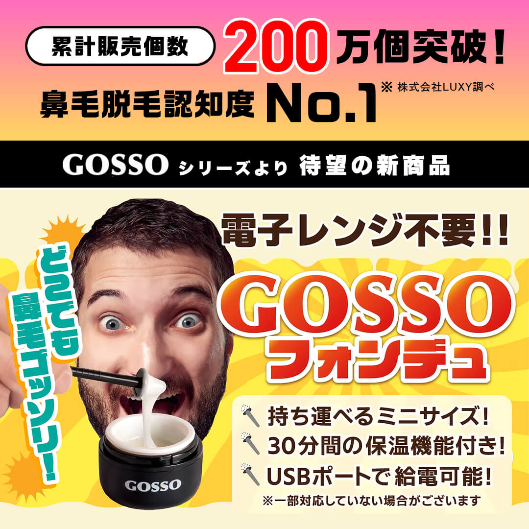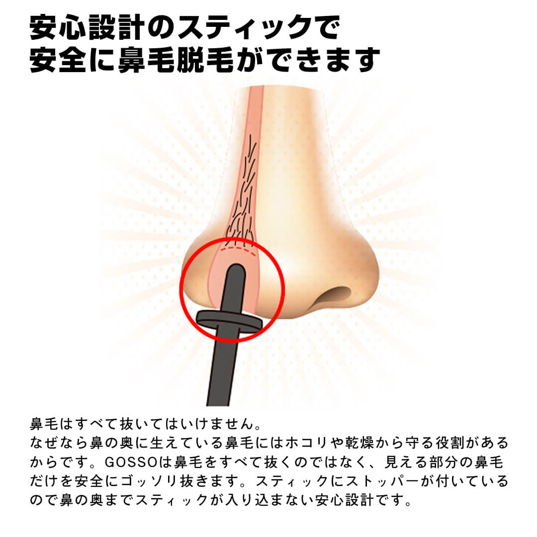 A:毛の根元は皮膚の中で毛細血管と繋がっており、脱毛により稀に出血する場合がございます。万が一出血がした場合は、軽くティッシュで押さえて頂き、様子を見て下さい。また、鼻の中に瘡蓋がある場合は、ワックスにより瘡蓋をはがす恐れがあるのでご使用はお止めください。出血直後のGOSSOのご使用はお控え下さい。
