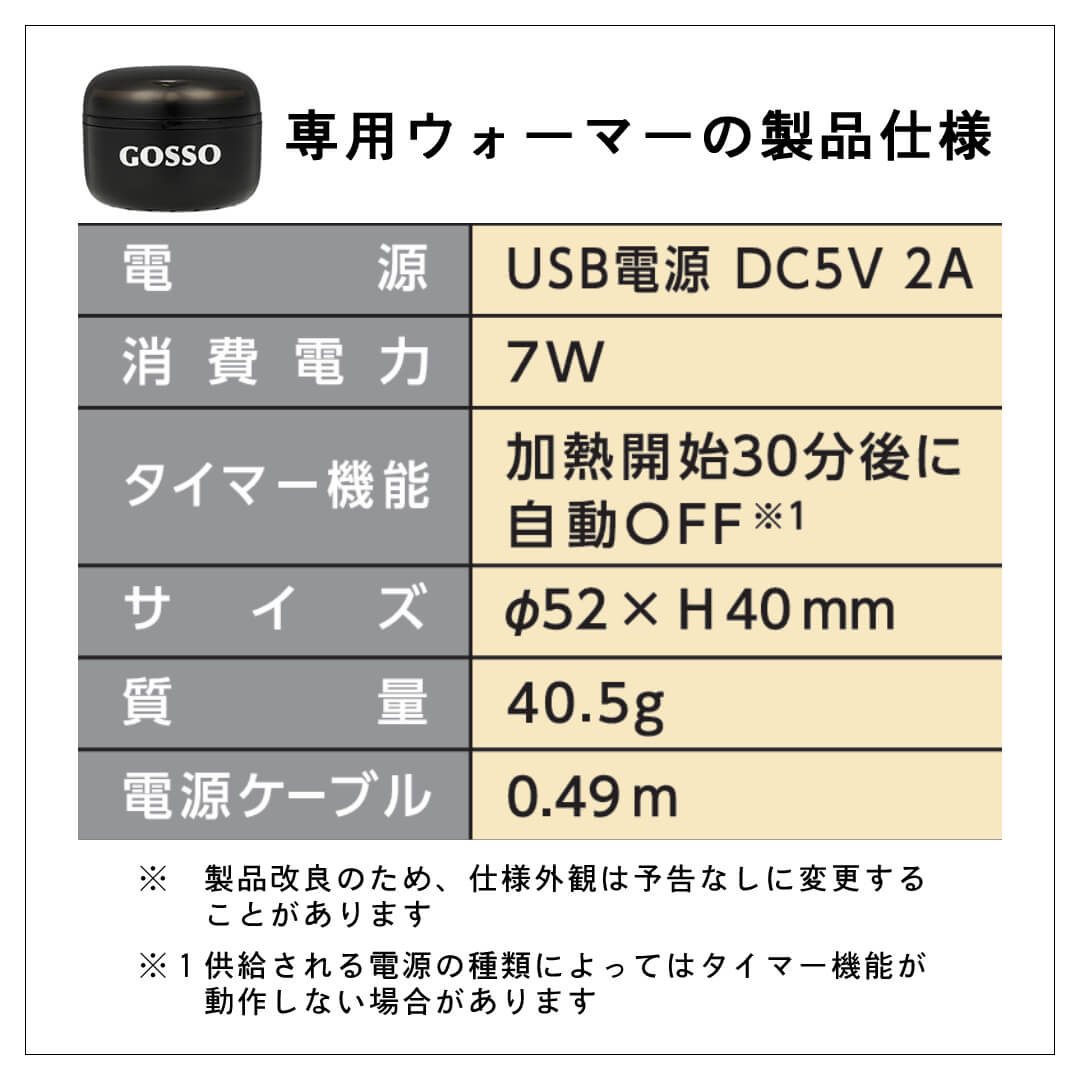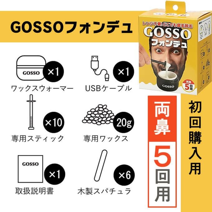 - 専用ワックスウォーマー×1台・USBケーブル×1本(タイプA→タイプC)・専用スティック×10本 ・GOSSOブラジリアンワックス×20g(両鼻5回分)・木製スパチュラ×6本・取扱説明書