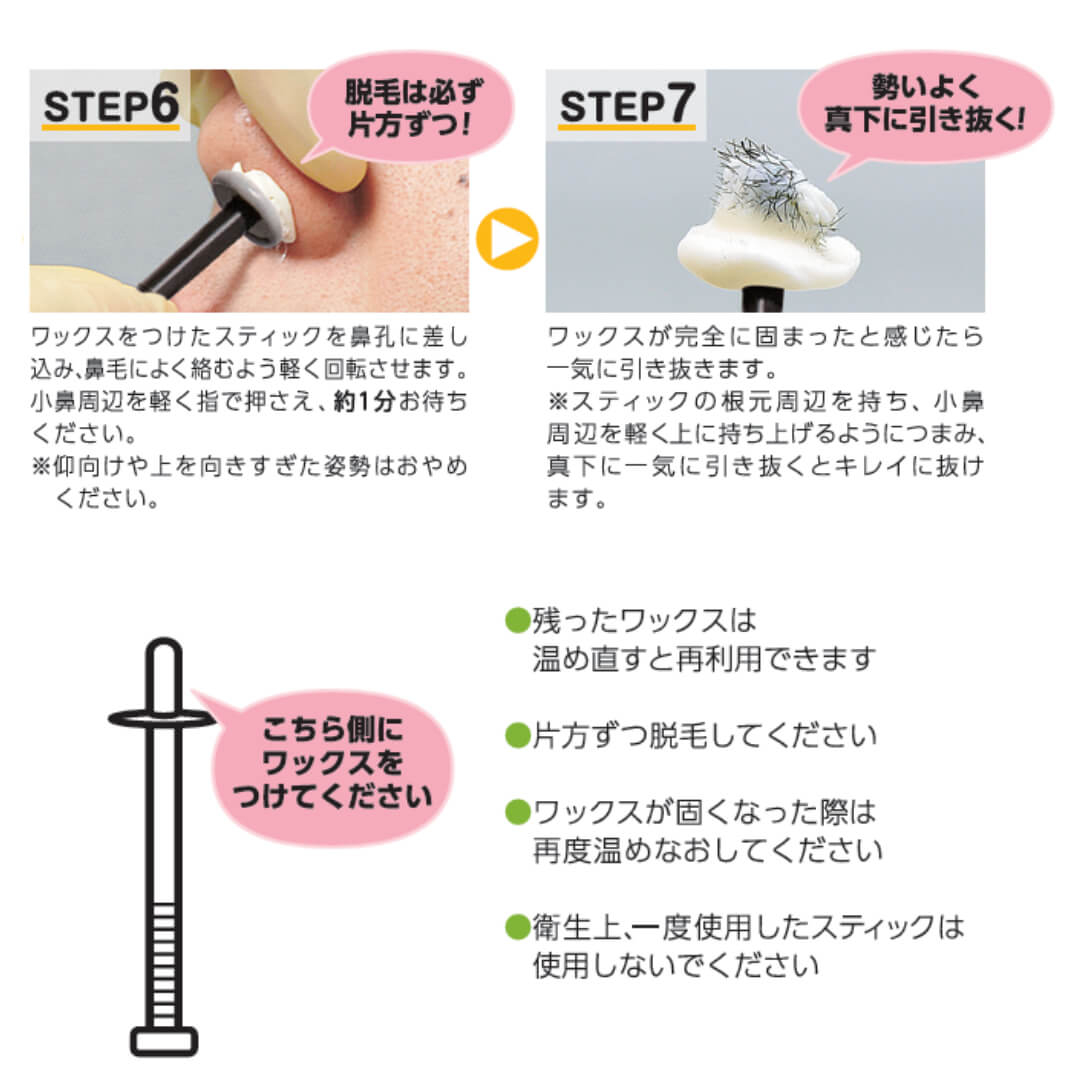 A:残ったワックスは、再度ご使用頂けますが、市販のノーズ専用スティックにて、脱毛仕切れなかった部分等にお使い下さい。