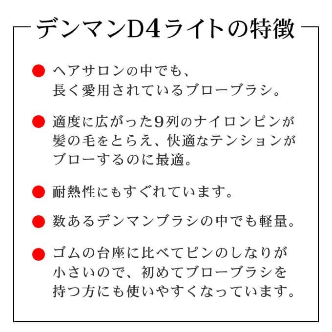 また、デンマン独自の研究された適度に広がった9列のナイロンピンが髪の毛をとらえ、台座部分のカーブが髪の毛によく沿う事で快適なテンションがブローするのに適しており、耐熱性にもすぐれています。