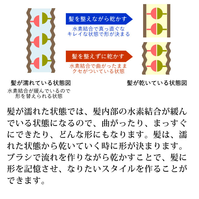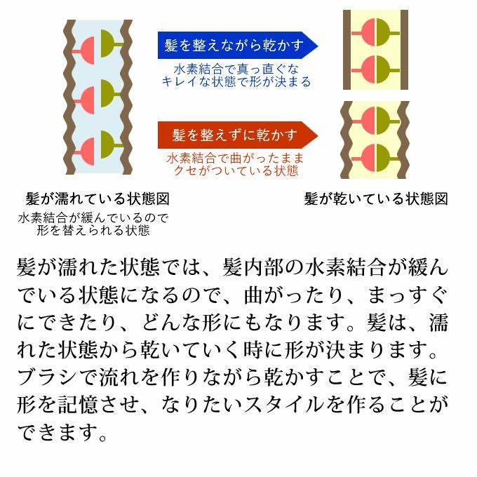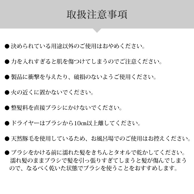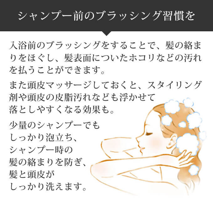 - 髪の絡まりを無理に引っぱらず毛先からやさしくときほぐして、その後根元から毛先にかけ優しくブラッシングしてください。