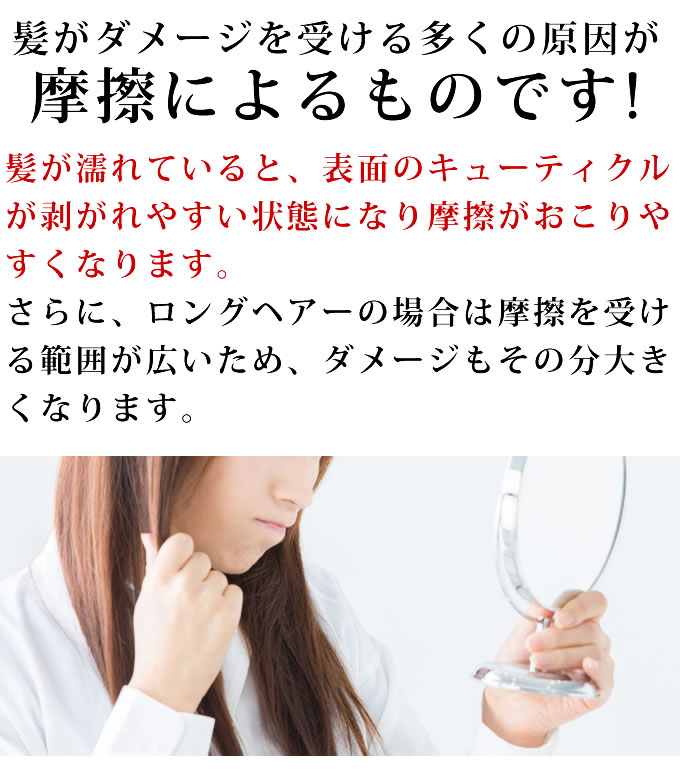 濡れた髪はキューティクルが開いた状態となり、ダメージを受けやすくなっています。
