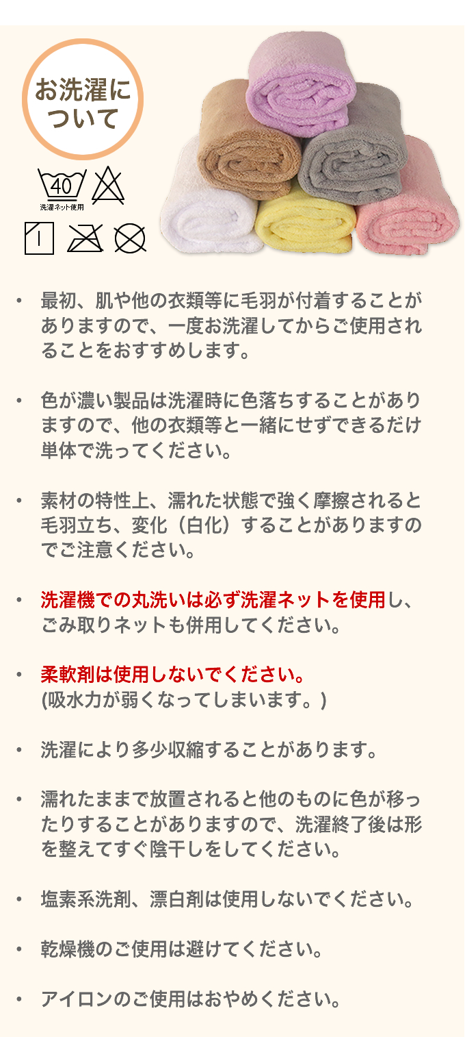 ※タオルの繊維がとても細かく、肌への負担を避けるため、ゴシゴシと擦る事はおやめください。 - 製品仕様