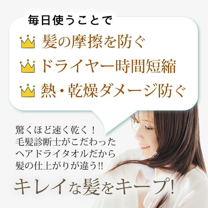 優れた吸水力・吸水スピードで、ドライヤーの時短を叶え、髪への負担を最小限に抑えます。