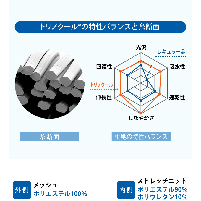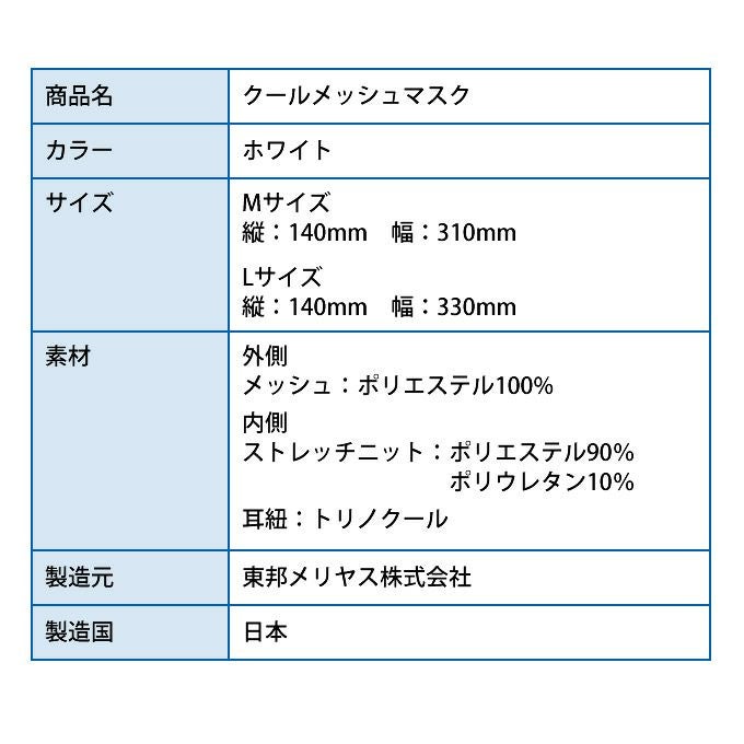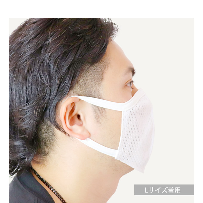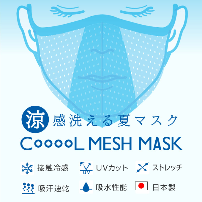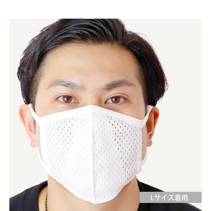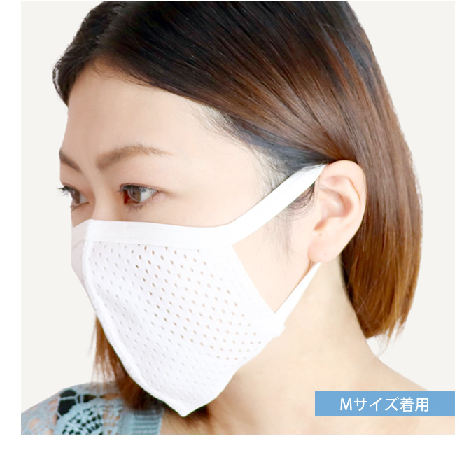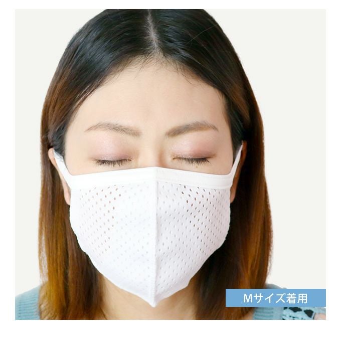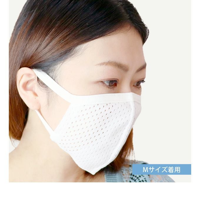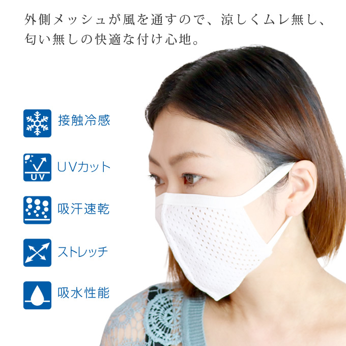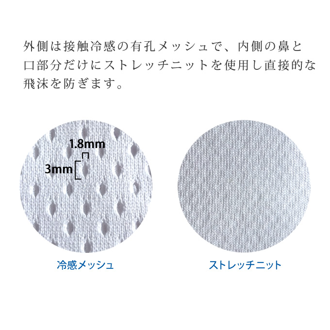 外側は接触冷感の有孔メッシュで、内側の鼻と口部分だけにストレッチニットを使用し、直接的な飛沫を防ぎます。