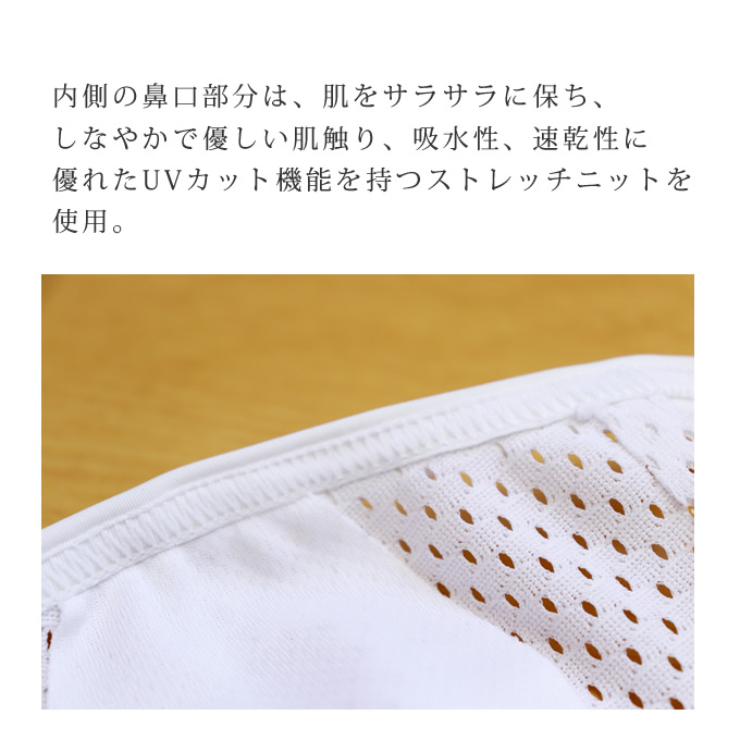 内側の鼻口部分は、肌をサラサラに保ち、しなやかで優しい肌触り、吸水性、速乾性に優れたUVカット機能を持つストレッチニットを使用。