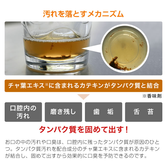 効果のヒミツは配合成分が口腔内のタンパク質汚れを絡め取って固めて出すというもので、汚れを目で見て実感!