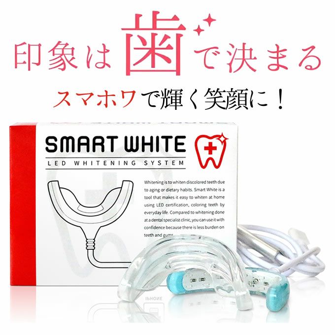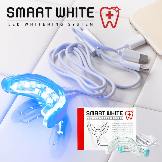 別売りの「スマホワWゲル」を歯に塗り、マウスピースをスマートフォンに繋ぎLEDを発光させ、口に装着するホームホワイトニングです。