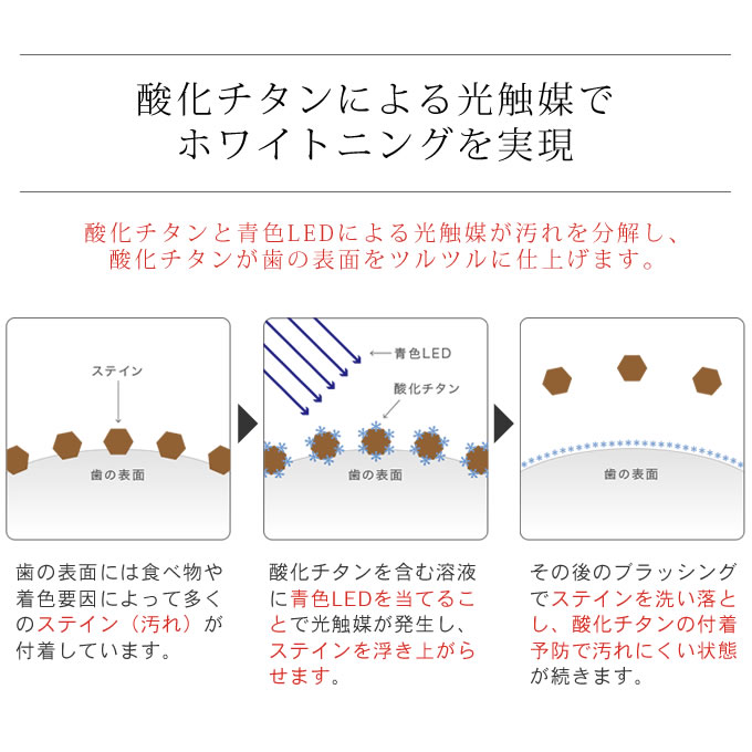 光触媒とは、酸化チタン(無害な真っ白な物質)にLEDを照射することで歯を白くする化学反応を促進させること。