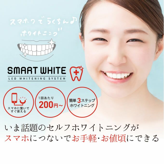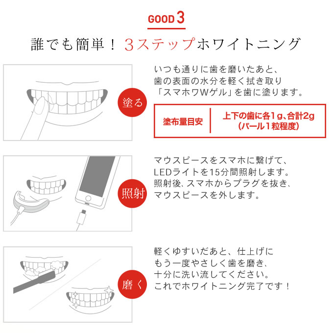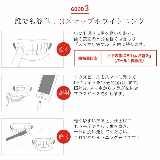 「スマホワWゲル」を歯に塗り、マウスピースをスマートフォンに繋ぎLEDを発光させ、口に装着するホームホワイトニングです。