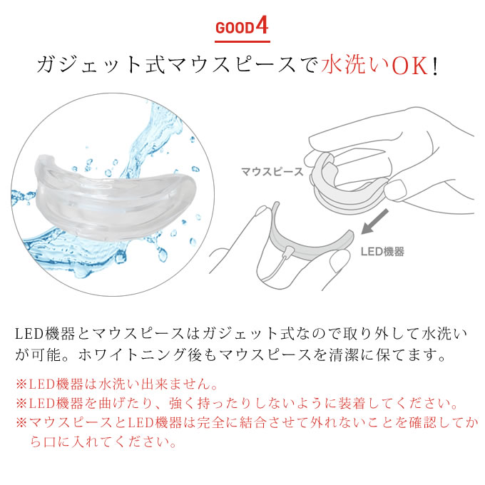 LEDとマウスピースが離れて綺麗に洗えるガジェット式。