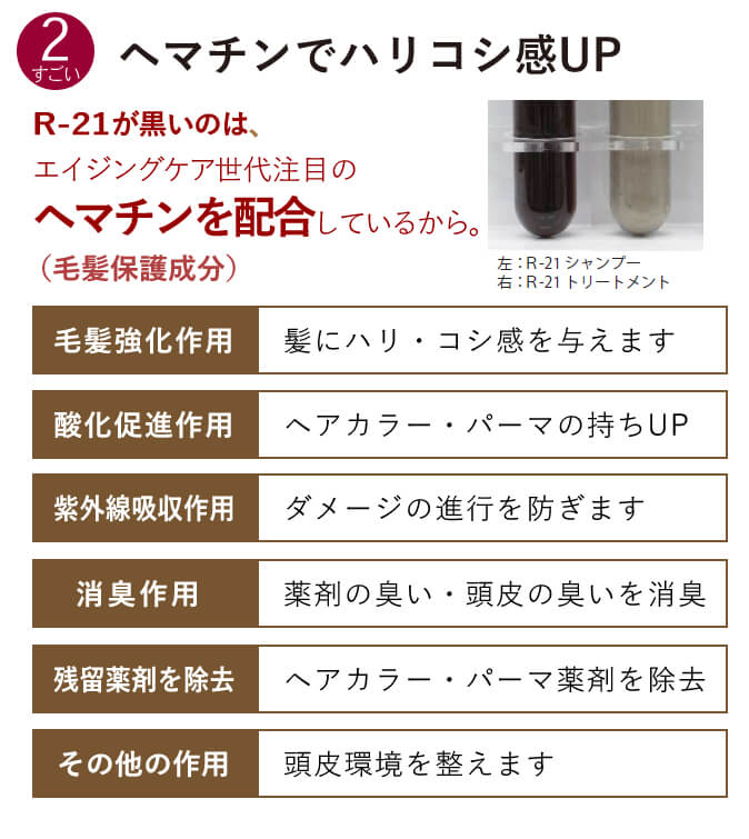 EXには、R-21よりヘマチンや発酵成分が2倍配合されているので、補修力・ハリコシ感・うるおいがUP。
