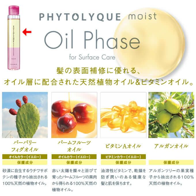 髪の表面補修に優れる、オイル層に配合された天然植物オイル&ビタミン。