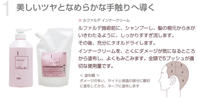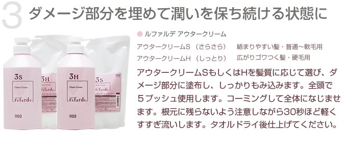 あらゆる髪質のベースを整えて根元から毛先まで均質な、美しく輝く髪へと導く、スリーステップトリートメント。指通り・ツヤ毛先までしっかりケアすることで、指通りとツヤを実感できます。