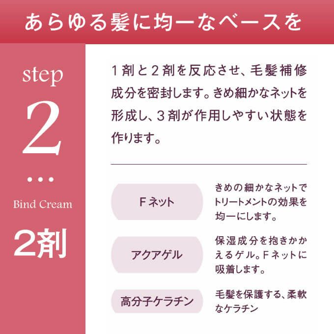 1剤と2剤を反応させ、毛髪補修成分を密封します。きめ細かなネットを形成し、3剤が作用しやすい状態を作ります。