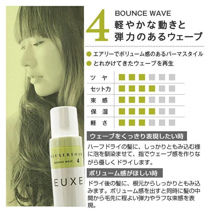 うるおいやなめらかさを与えながら、ほどよいリッジ感で、ふんわりとしたウェーブ感のパーマフォルムをつくり、スタイルを長時間キープします。