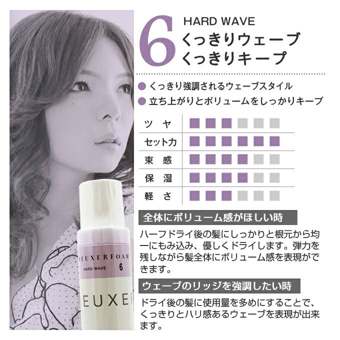 立体感や強めのウェーブもハリのある強めのリッジ感で、くっきりと表現するセット力を持ち、縦ウェーブやロングウェーブでもしっかりキープします。