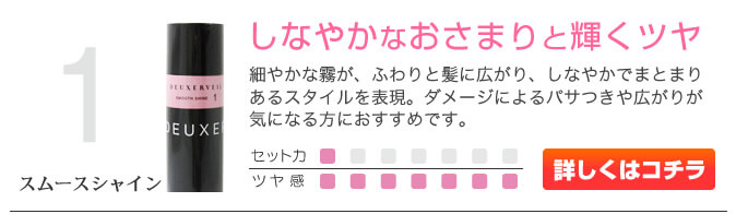 スプレーならではの細かな霧に、トリートメント効果があります。「ヴェールケア」と名付けた効果は、スタイリングと同時にヘアをダメージから守り、なめらかで美しいツヤを与えます。