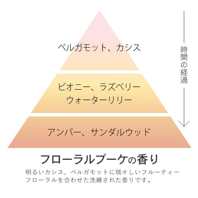 明るいカシス、ベルガモットに瑞々しいフルーティーフローラルを合わせた洗練されたフローラルブーケの香り。