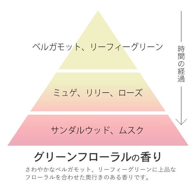さわやかなベルガモット、リーフィーグリーンに上品なフローラルを合わせた奥行きのあるグリーンフローラルの香り。