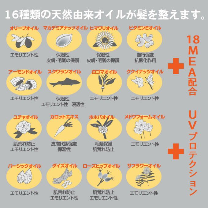 既存の十六油(ジュウロクユ)と同じ16種類の天然由来オイル配合で、髪のツヤと潤いをキープします。