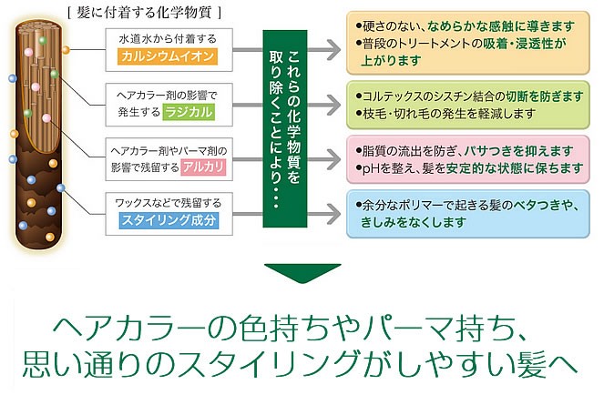余分な油分やポリマーで起きる髪のベタつきやキシミをなくします。