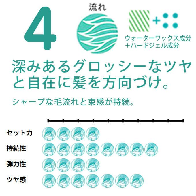 ウォーターワックス成分は自在に髪を動かしやすく、シャープな毛流れとグロッシーな質感を表現。